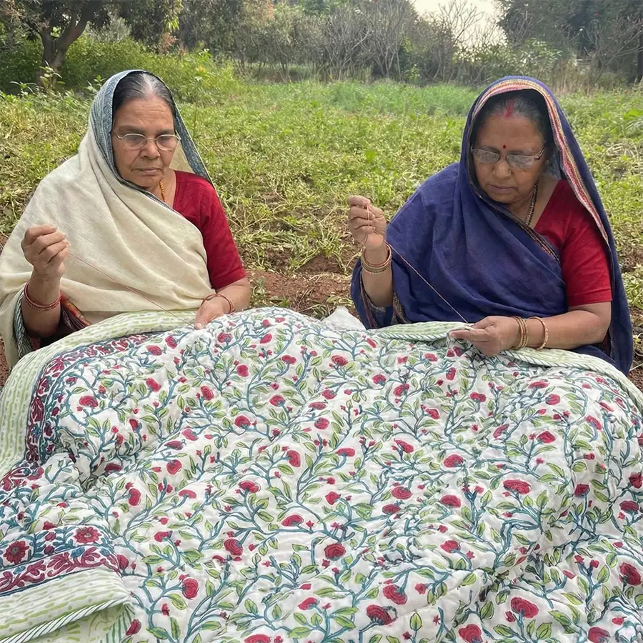 The prints are created using traditional hand block printing, where skilled artisans stamp natural motifs onto fabric using hand-carved wooden blocks. The quilting itself is done by hand, stitch by stitch, the slow way it has always been done—because machines cannot replicate patience.